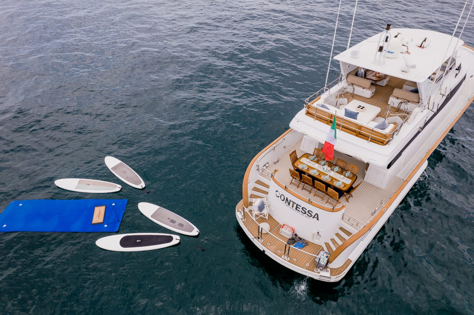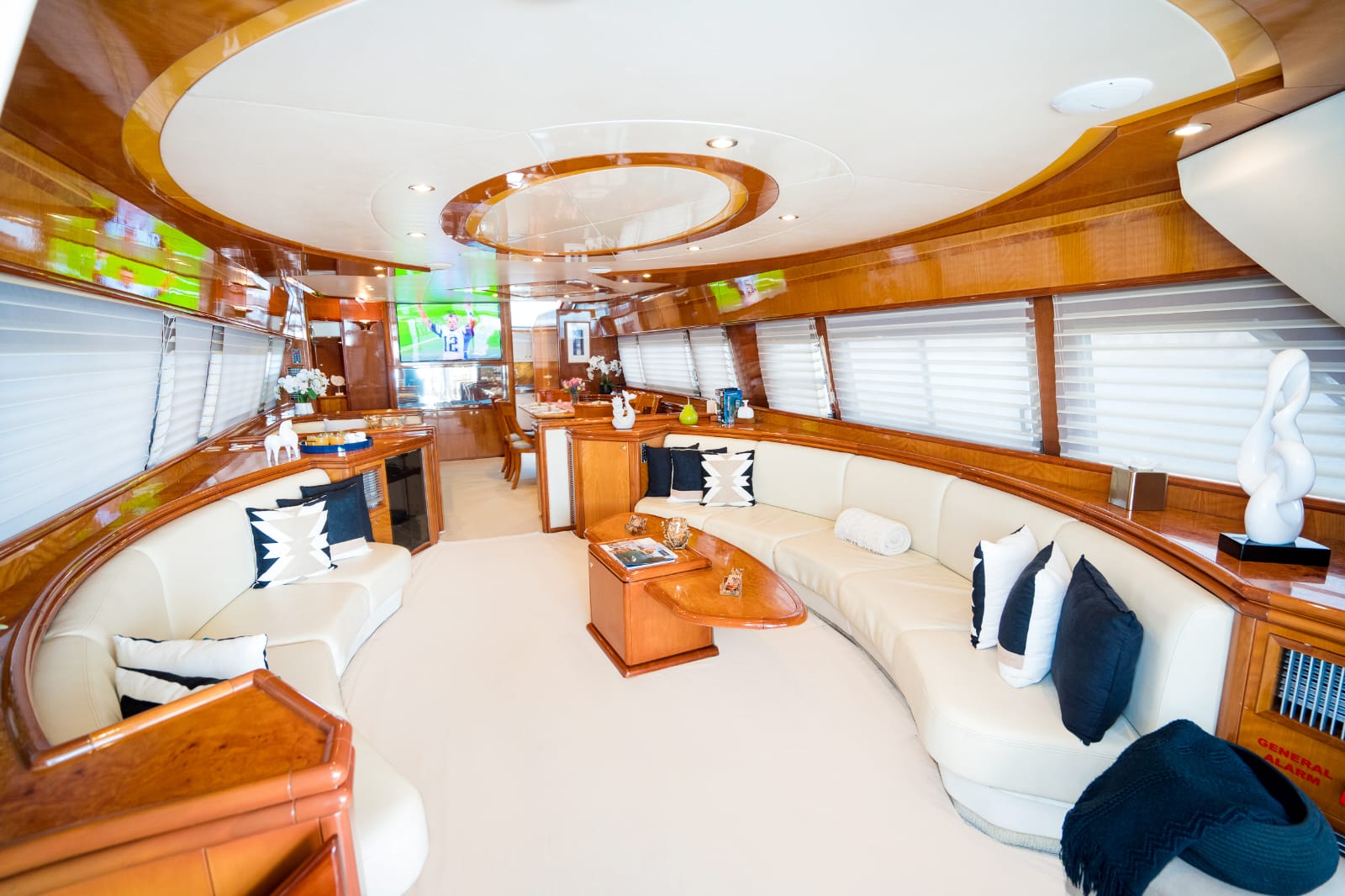 Features spacious decks, elegant salon, dining for 8, HD TV, premium sound, and full galley.